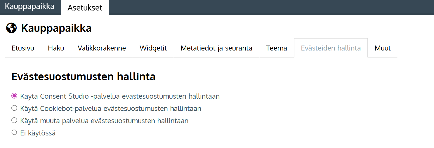 Evästeiden hallintaan Johkussa löytyy toistaiseksi kolme integraatiota joita voit käyttää. Nämä vaihtoehdot löydät Kauppapaikan asetusten Evästeiden hallinta-sivulta.