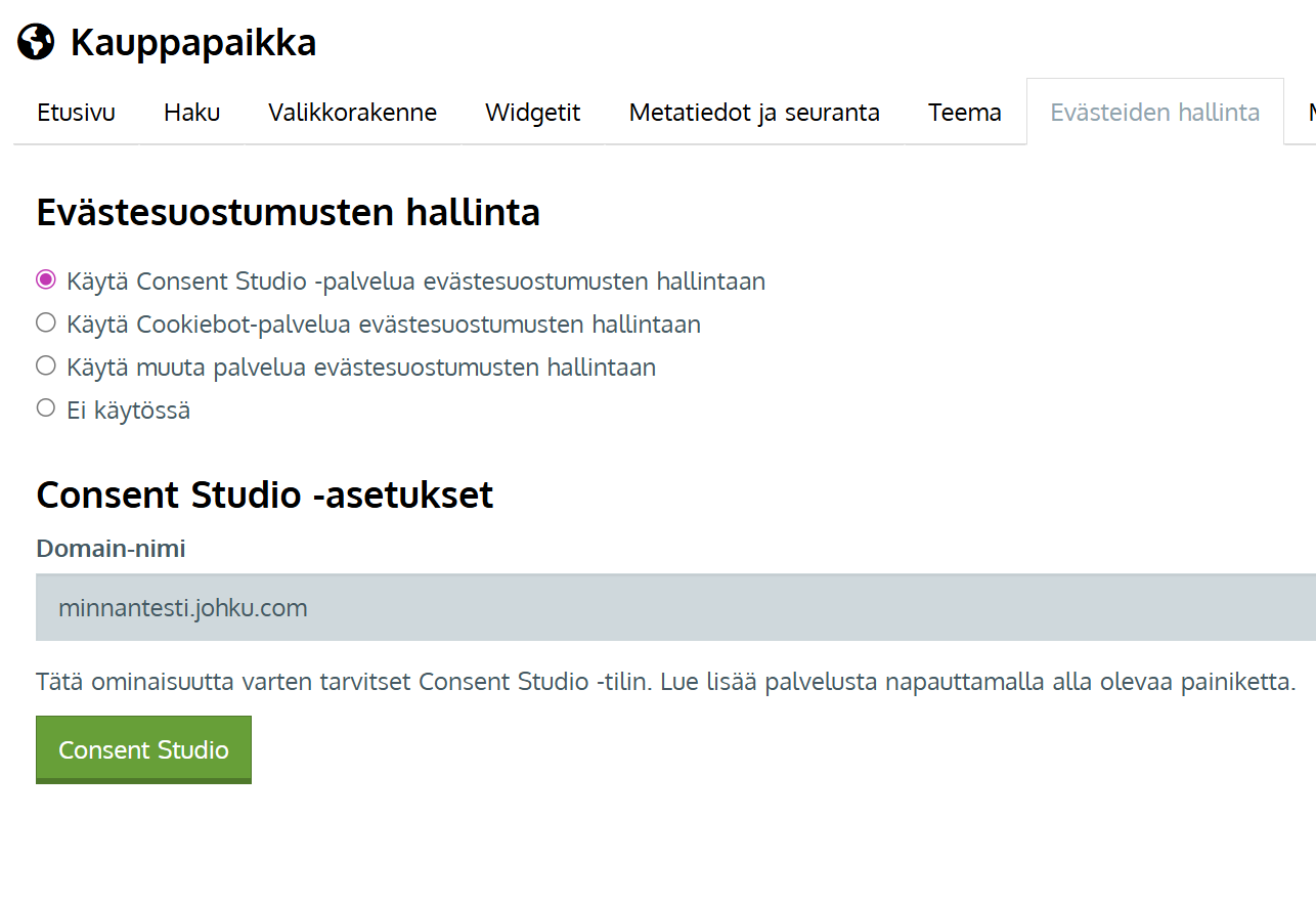 - Palaa Johkuun Evästeiden hallinta -sivulle, ja tarkista että valinta on kohdassa Consent Studio