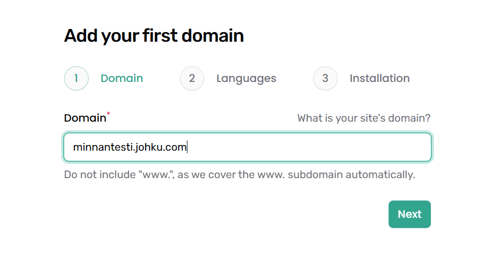 Saat tietojen syötön jälkeen esille valinnat ensimmäisen domainisi eli Johku-sivustosi lisäämiseen