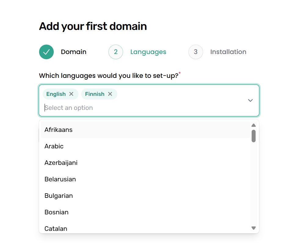 Valitse Languages -kohdassa alasvetovalikosta ne kielet, joilla haluat että evästeistä ilmoitetaan sivustollasi