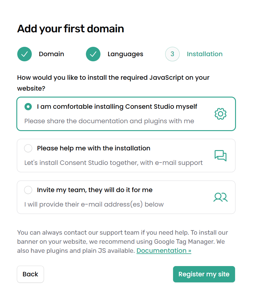 Valitse Installation -kohdassa ylimmäinen vaihtoehto “I am comfortable installing Consent Studio myself”