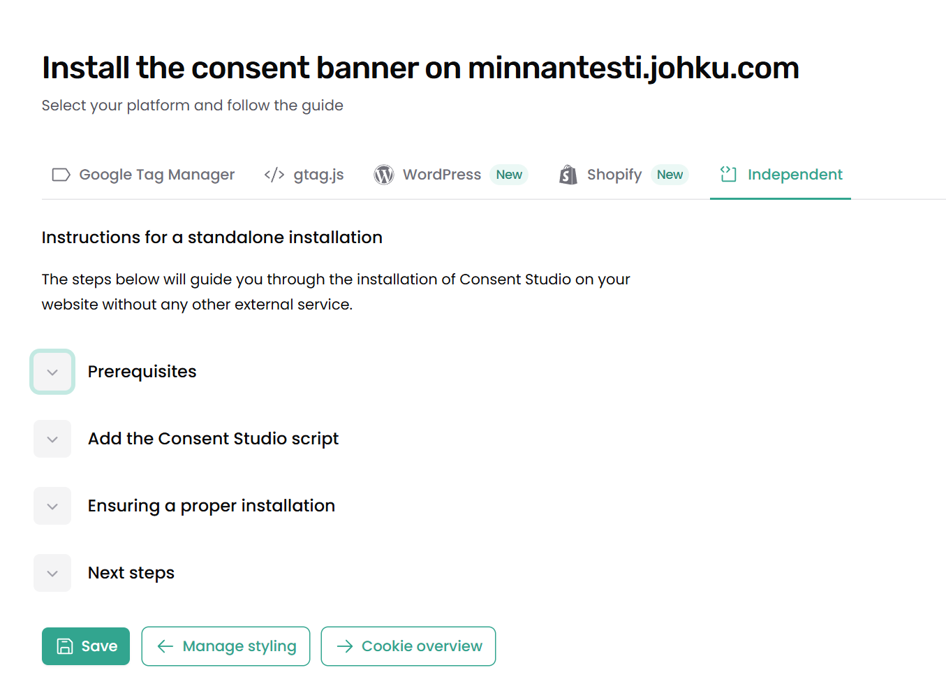 - Valitse Install the consent banner -kohdassa välilehti Independent