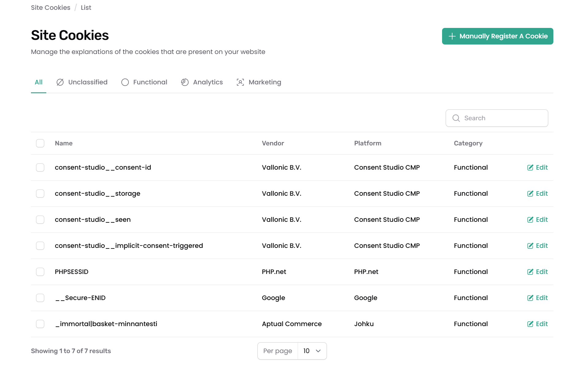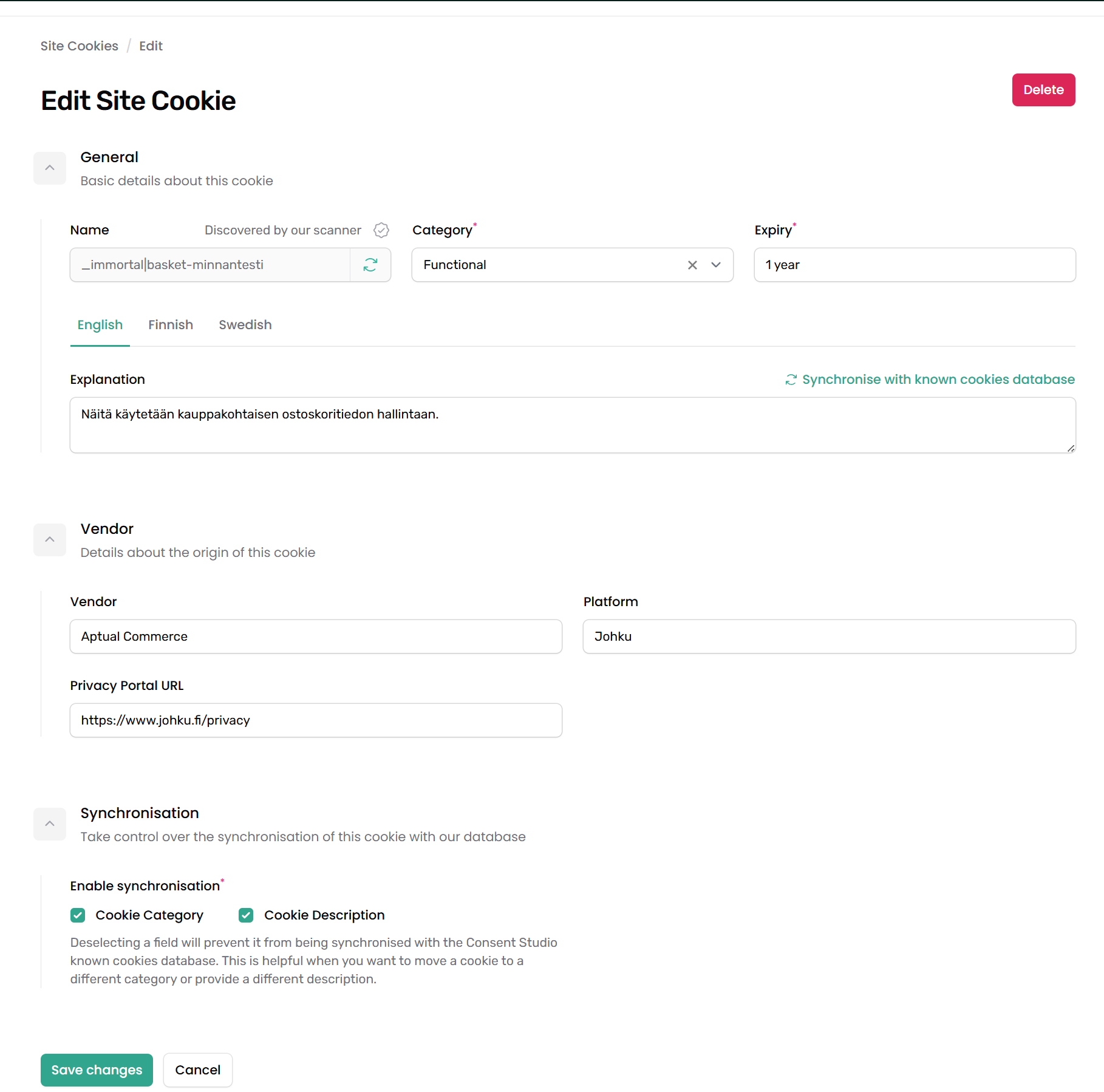 - Tarkista kaikki myös muut Site Cookies -sivulla listatut evästeet ja tee kategoria- ym. tiedot mikäli tiedot ovat tyhjät
