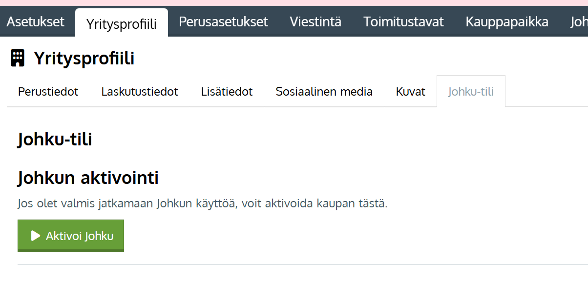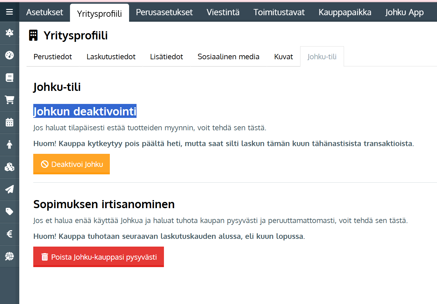 Mikäli sinulla ei ole enää tarvetta Johku-kaupalle yritystoiminnan sulkemisen tai muun muuttuneen tilanteen vuoksi, tai haluat kauppasi väliaikaisesti pois käytöstä, voit deaktivoida kaupan Johkun asetuksista käsin. Huomioi että suljettu kauppa säilyy Johkussa ja on aktivoitavissa myöhemmin uudelleen. Mikäli haluat irtisanoa Johku-sopimuksen ja poistaa kaupan pysyvästi kaikkine sisältöineen, katso ohjeet täältä: ➡️Kaupan poistaminen, Johku-sopimuksen irtisanominen
