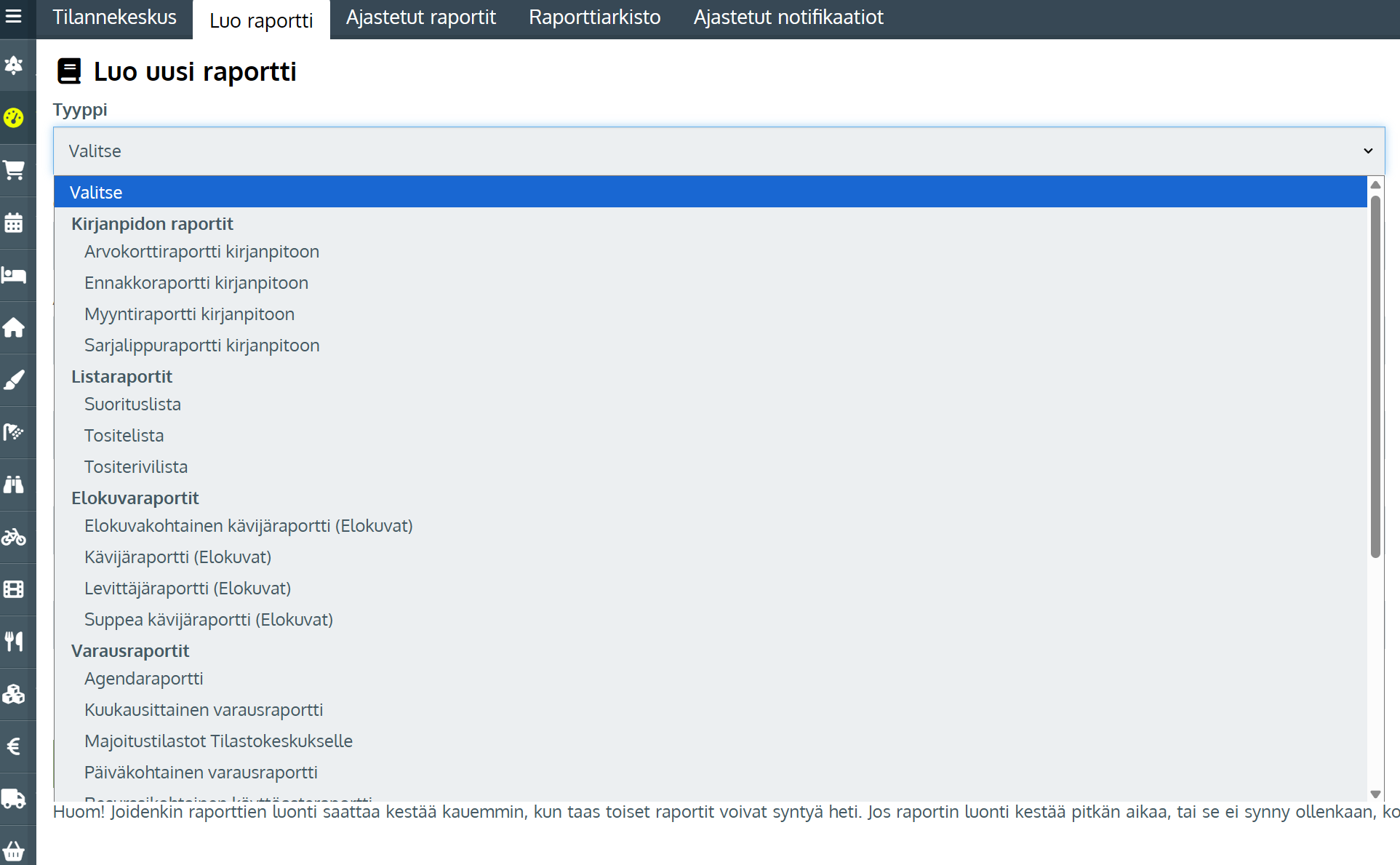 Valitse alasvetovalikosta haluamasi raporttityyppi