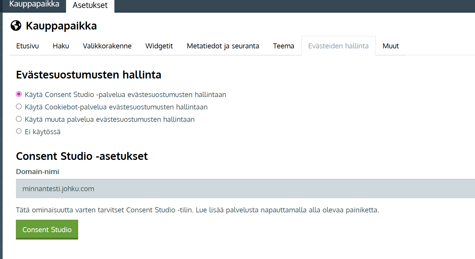 Huomioi että seuranta edellyttää evästeiden hallinnan kytkemistä Johkuun. Valitse evästeiden hallinnan kanava Kauppapaikan asetusten Evästeiden hallinta -sivulla. ➡️Evästeiden hallinta
