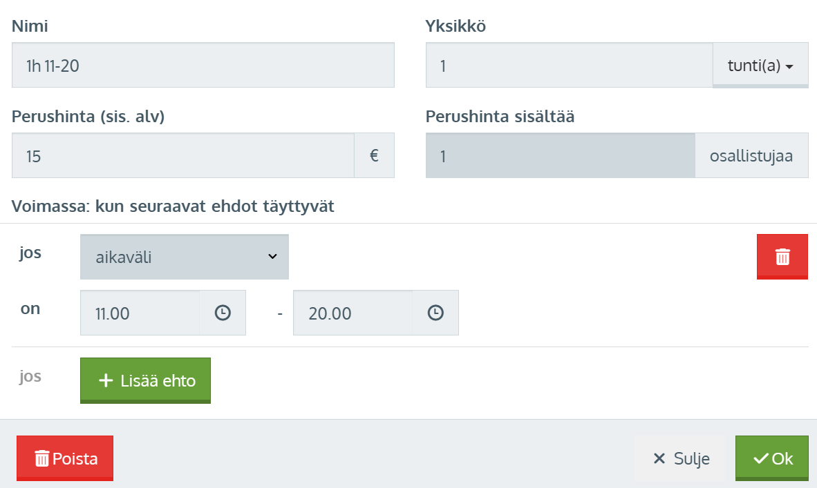 - Syötä esille tuleviin ehtokohtaisiin kenttiin haluamasi päivämäärä-, viikonpäivä-, kesto- tai henkilömäärätiedot