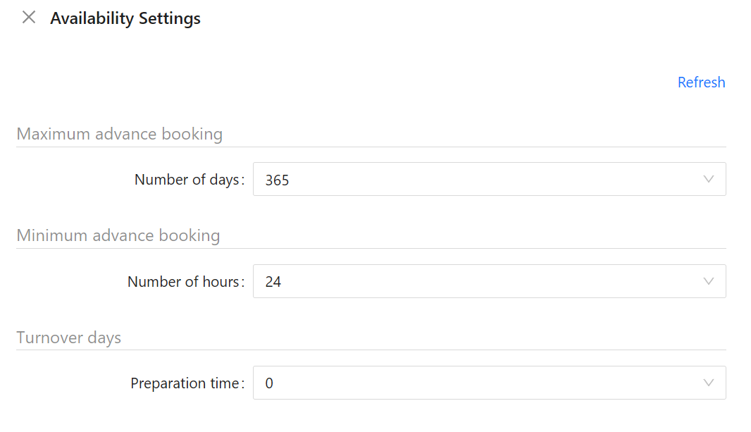 Tarkista Listing-välilehden Availability Settings-kohdan Maximum advance booking-kohdassa on haluamasi aika, kuinka pitkälle tulevaisuuteen otat varauksia. Maksimilukema on 365. All dates available -valinnalla et aseta määrärajoituksia, mutta Johku tarjoilee saatavuutta noin 2 vuoden päähän