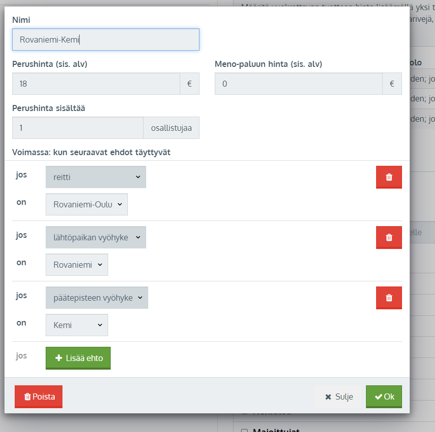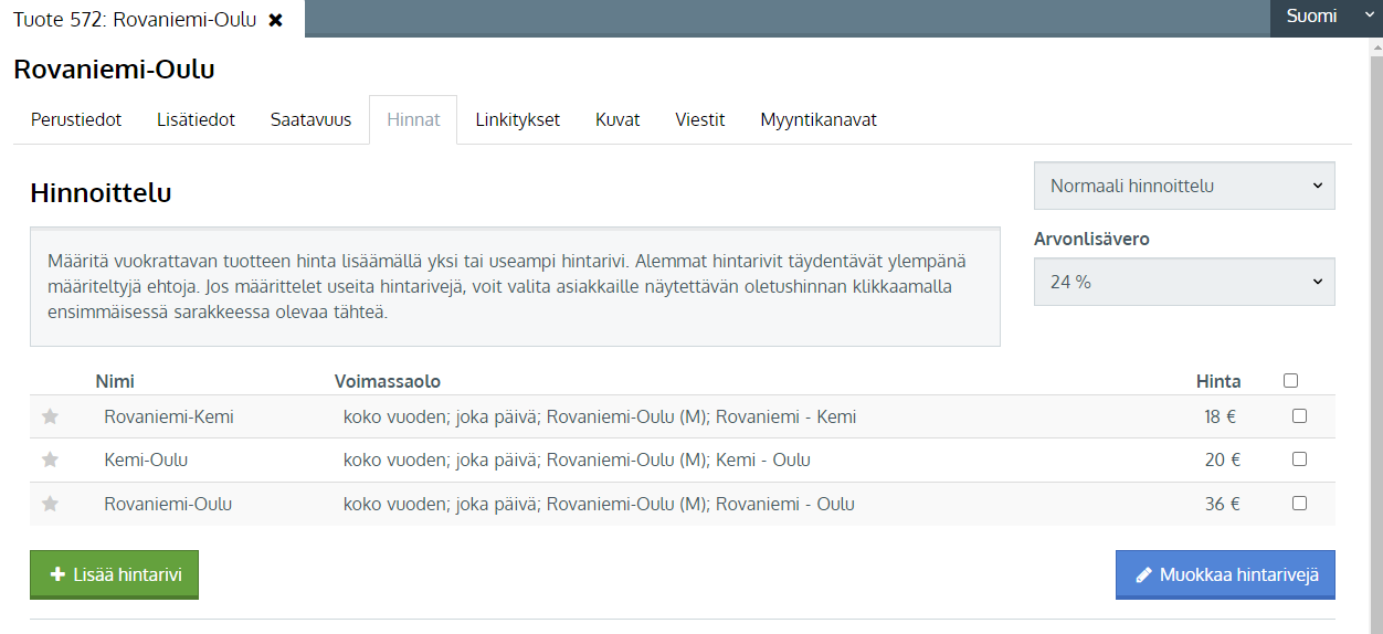 || **Kuljetustuotteen hinnoittelu luodaan pysäkkivälikohtaisten hintarivien kautta. Jos jollekin pysäkkivälille ei ole hintariviä olemassa, asiakas ei voi ostaa matkaa ko. välille. Hinnoittelun asettamiseksi kuljetustuotteen reitti sekä vyöhykkeet täytyy olla asetettuna/olemassa. Jos niitä ei vielä ole, luo ne ensin.