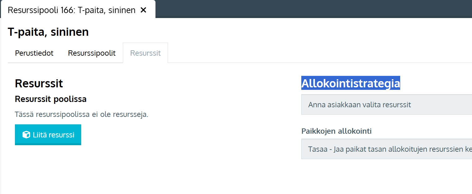 - Mene resurssipoolin Resurssit-välilehdelle ja valitse Allokointistrategia-kohtaan Anna asiakkaan valita resurssit