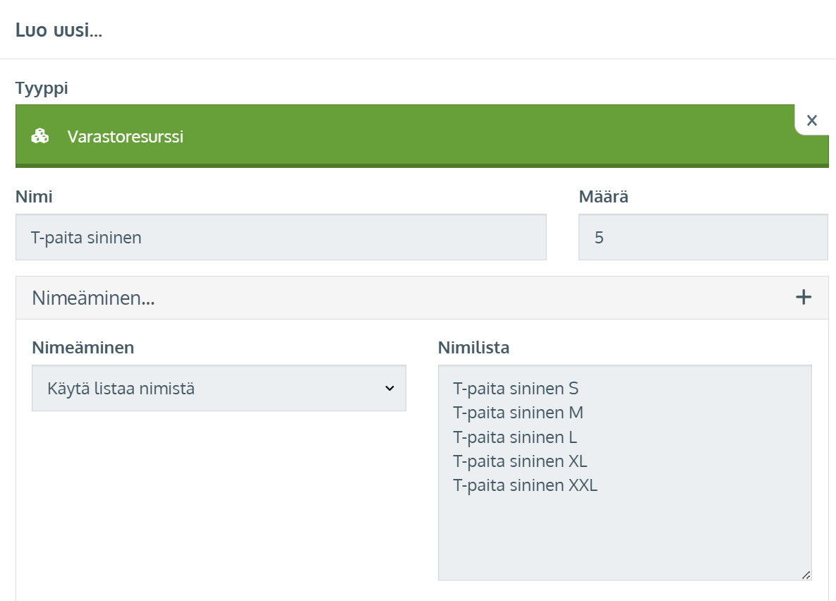 - Syötä resurssien (variaatioiden) nimet allekkain Nimilista-kohtaan. Syötä yhtä monta nimeä kuin valitsit resurssin Määrä -kohtaan