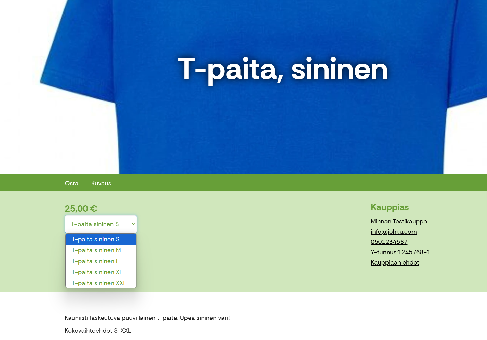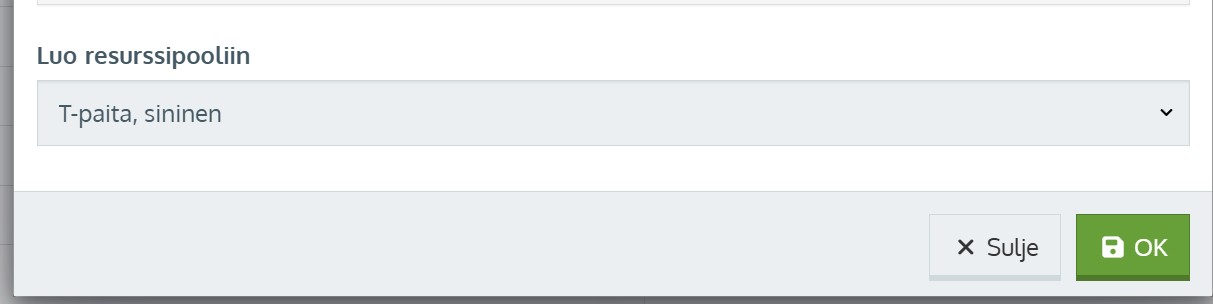 Jos kaupassasi on myynnissä erikokoisia ja -värisiä tuotteita, esim. vaatteita, voit varioida tuotteita resussipoolin ja siinä olevien ostettava -tyyppisten resurssien kautta. Tällöin saat tuotteelle esille resurssivalikon, josta asiakas valitsee haluamansa värin/koon.