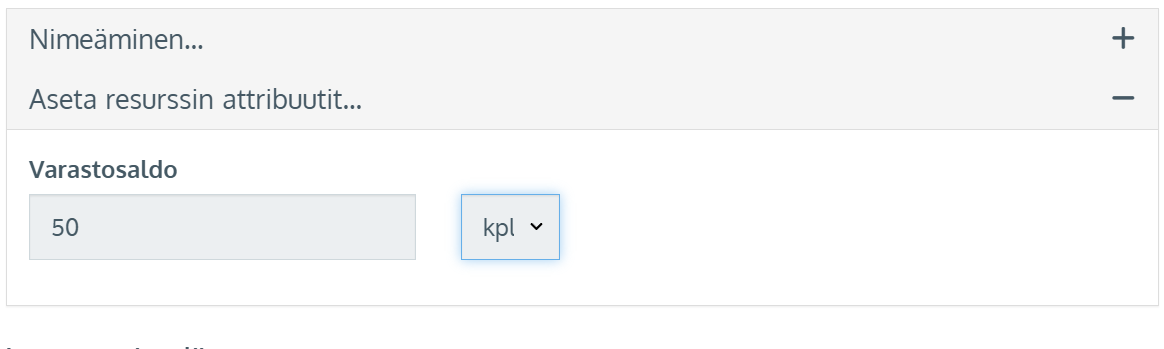 - Jos kaikkia variaatioita on saman verran varastossa, voit asettaa Aseta resurssien attribuutit-kohdassa varastosaldon, joka tulee jokaiselle resurssille käyttöön. Valitse kpl-vaihtoehto
