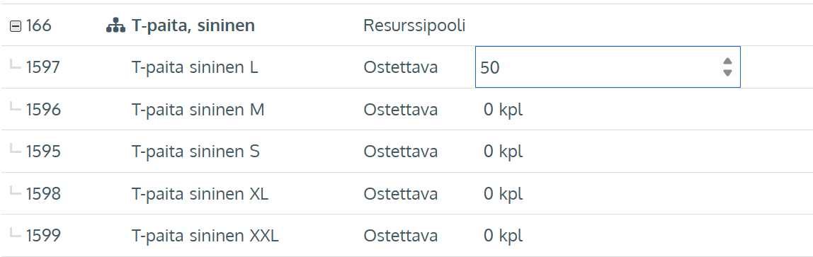 **Ostettava tuote -tyyppiset tuotteet on mahdollista varioida resurssipoolin ja varastoresurssien avulla. Tällöin asiakkaalle tuodaan esim. eri kokovaihtoehdot resursseina esille ja valittavaksi.