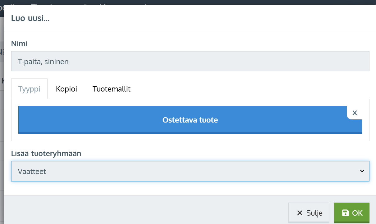 - Syötä nimi kokovariaatiolle, esim. tuotteen nimi, koko -tyyppisesti