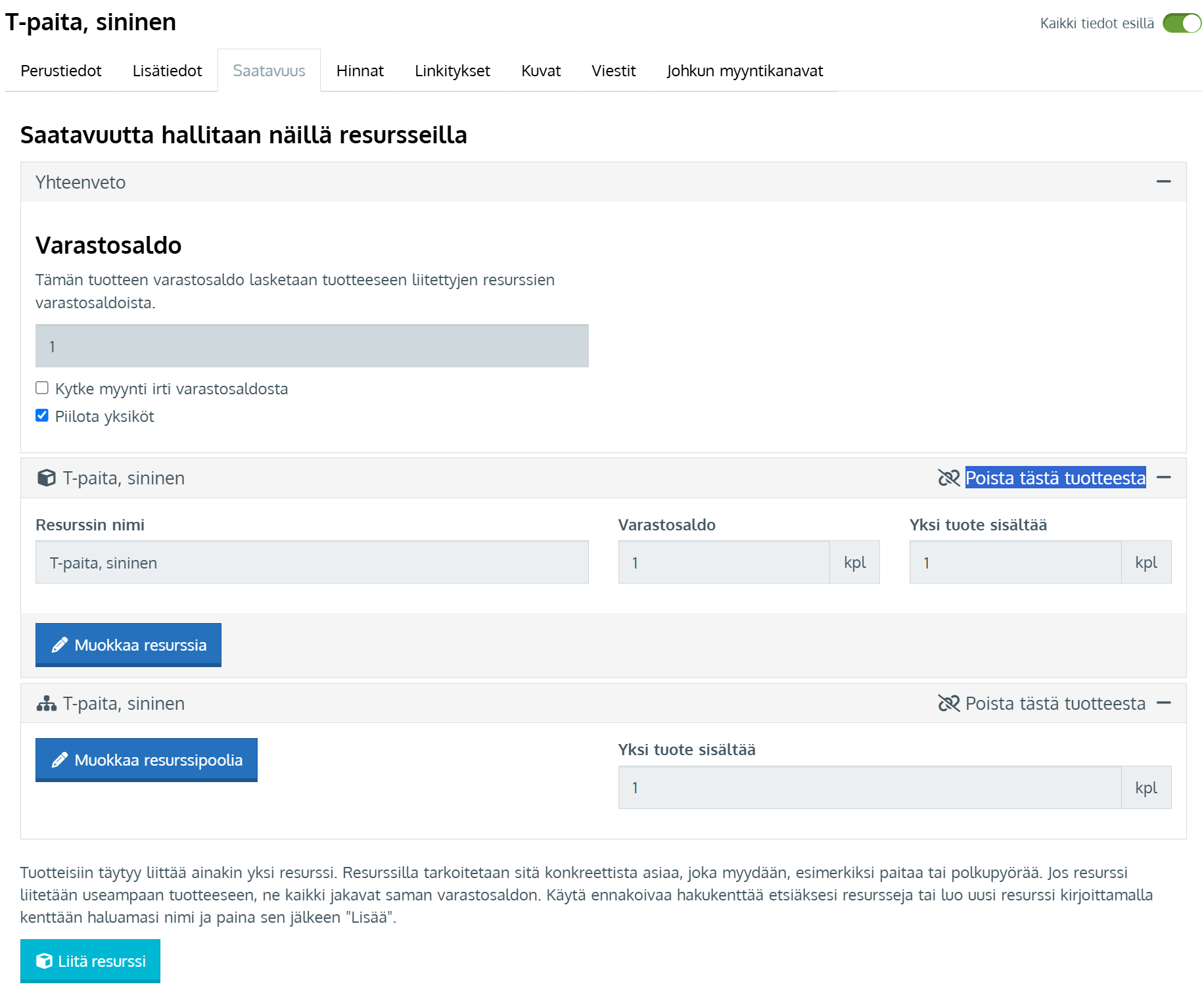 Jos jokaista variaatiota/resurssia on eri määrä varastossa, syötä kullekin oma varastosaldo. Kätevimmin tämä onnistuu suoraan Resurssit-sivulta