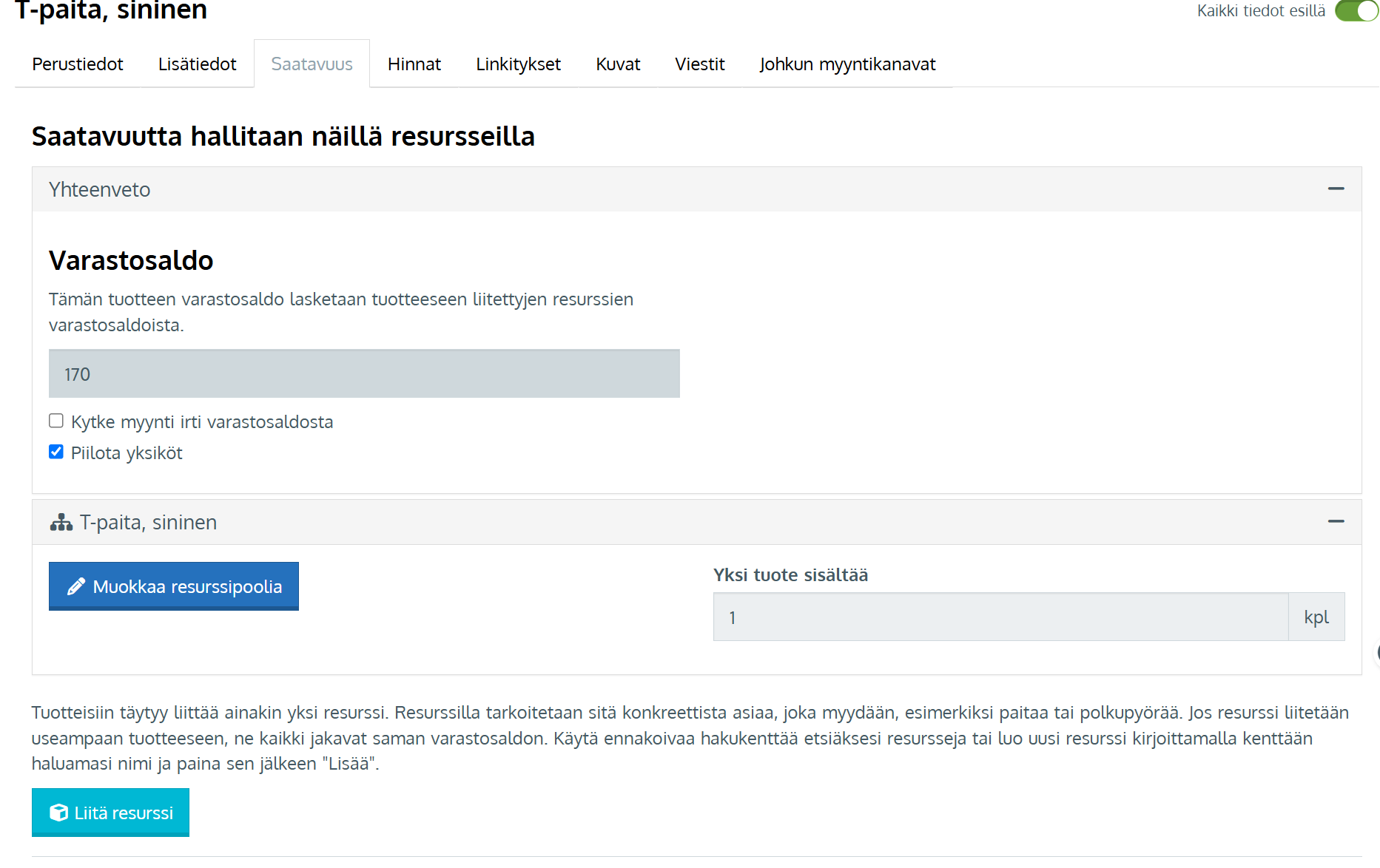 Tuotteen Yhteenveto-kohdassa ilmoitetaan kokovariaatioiden varastossa oleva määrä yhteensä. Voit myös kytkeä varastosaldon kokonaan pois käytöstä jolloin varastosaldoja ei huomioida ja tuotetta on aina saatavilla