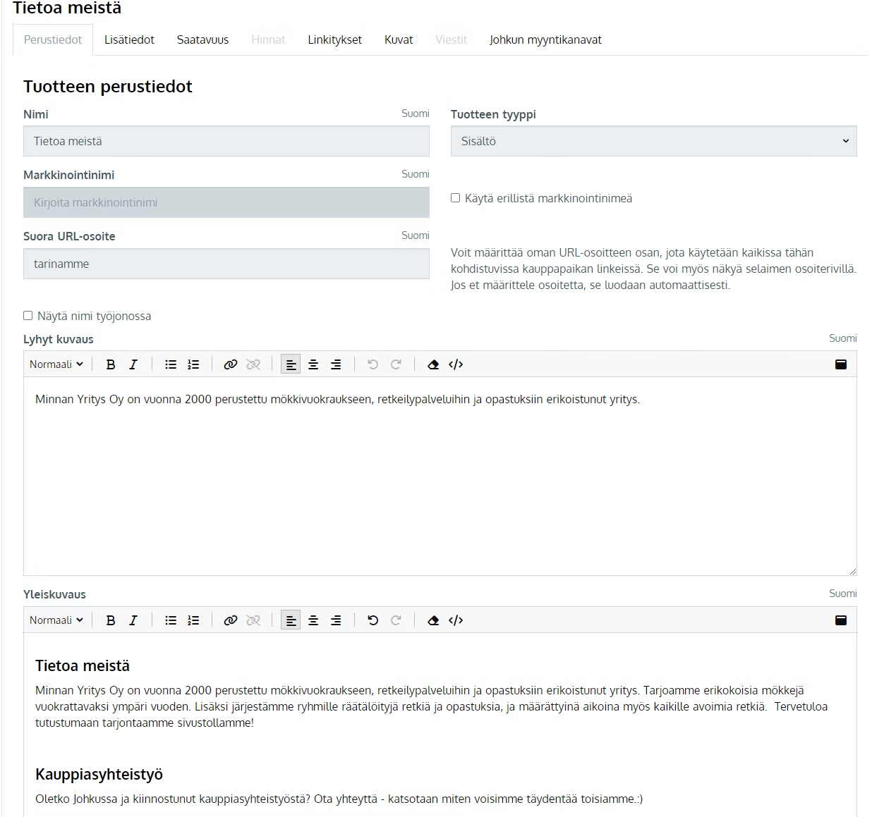 - Aseta tuotteelle Perustiedot-välilehdellä lyhyt kuvaus (n. 200 merkkiä tai alle) sekä varsinainen pidempi sisältöteksti Yleiskuvaus-kohtaan