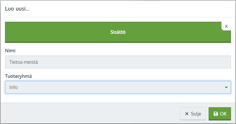 Sisältö on yksi Johkun tuotetyypeistä. Toisin kuin muissa tuotetyypeissä, sisältötuotteella ei ole mitään hinta-, aika tai osto-ominaisuuksia vaan se koostuu ainoastaan tekstistä ja kuvista. Lisäksi voit linkittää sisöltötuotteeseen muita tuotteita tai tuoteryhmiä. Optiot eivät ole sisältö-tuotteilla käytettävissä eikä sisältötuotteita voi asettaa optioiksi muihin tuotteisiin.