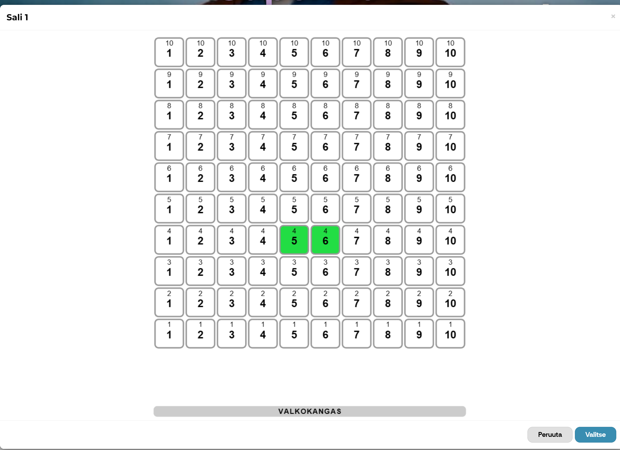 Jos paikkakarttaa käytetään, avautuu Valitse paikat-painikkeen jälkeen paikkakartta omaan ikkunaansa. Asiakas valitsee ikkunassa paikat klikkaamalla ja lopuksi Valitse-painiketta.