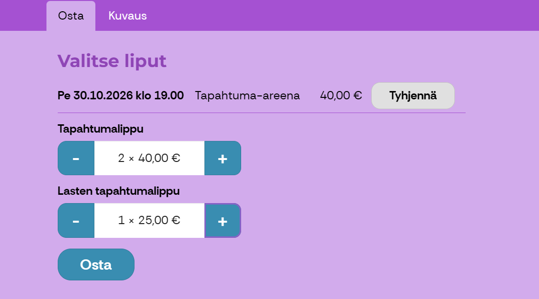 Tämän jälkeen avautuvat lipputyypit valittaviksi. Jos esitysaikoja on vain yksi eikä tuote käytä paikkakarttaa, lipputyypit avautuvat esille suoraan esitysajan alapuolelle.