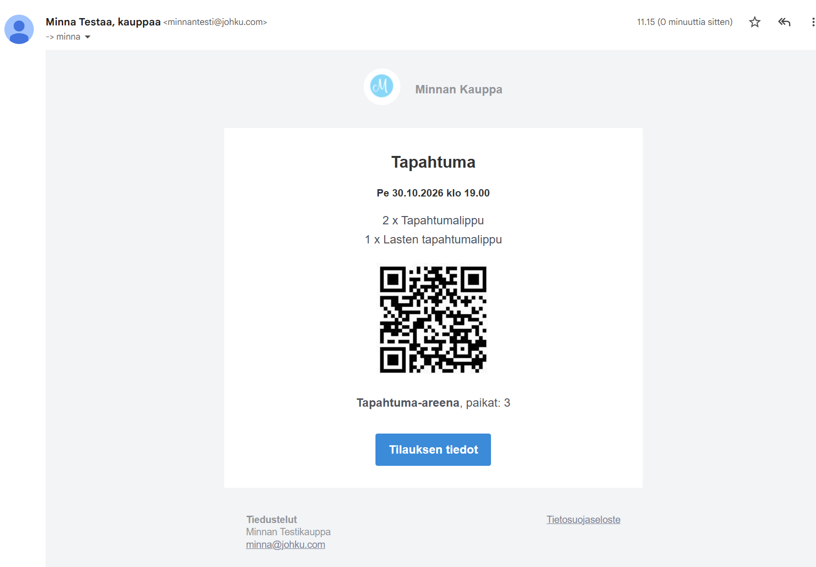Kun asiakas vie tilauksen loppuun eli syöttää tilaajatietonsa ja maksaa valitulla onlinemaksutavalla, lähtee hänelle automaattisesti kaksi sähköpostia: 1) Maksuvahvistus ja kuitti ja 2) Lippu-viesti. Tapahtuman liput ovat Lippu-viestin sisältönä.