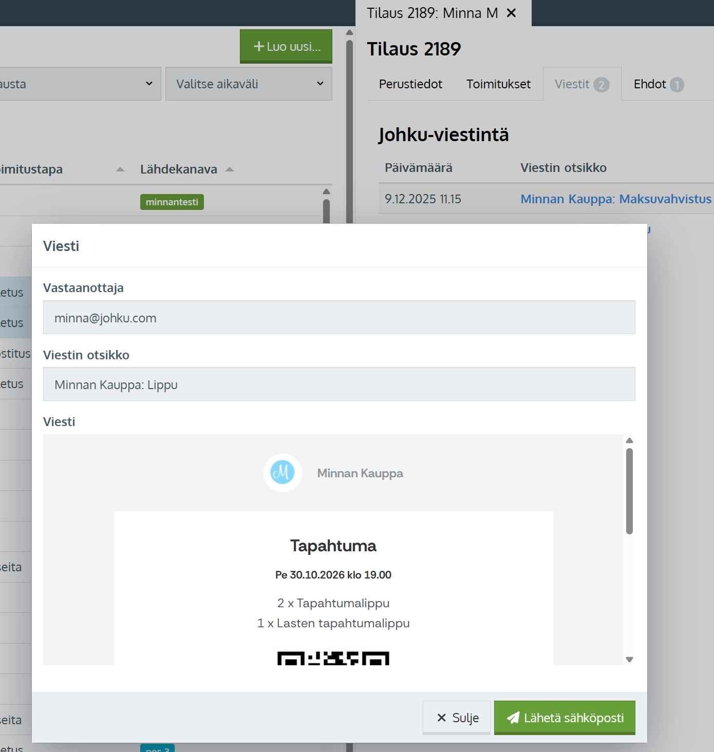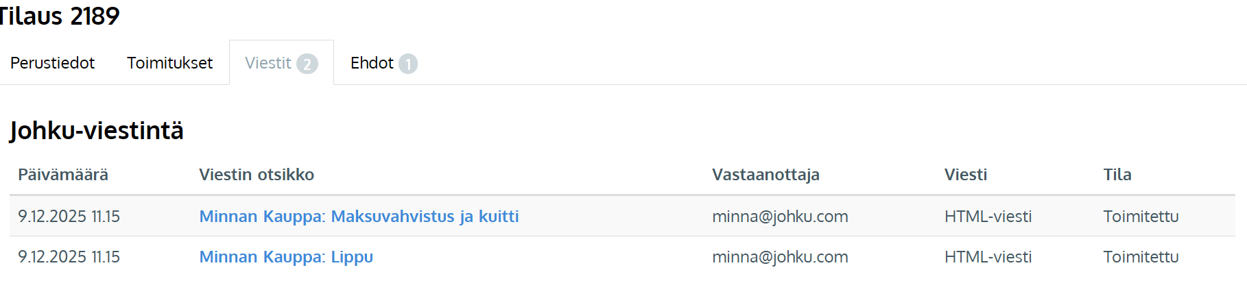 Kauppias näkee lähetetyt liput ja muut viestit lisäksi tilauksen Viestit-välilehdeltä kaupan ylläpidossa. Lipun voi tarvittaessa lähettää asiakkaalle uudelleen tilaukselta.