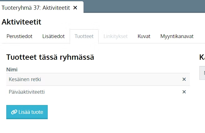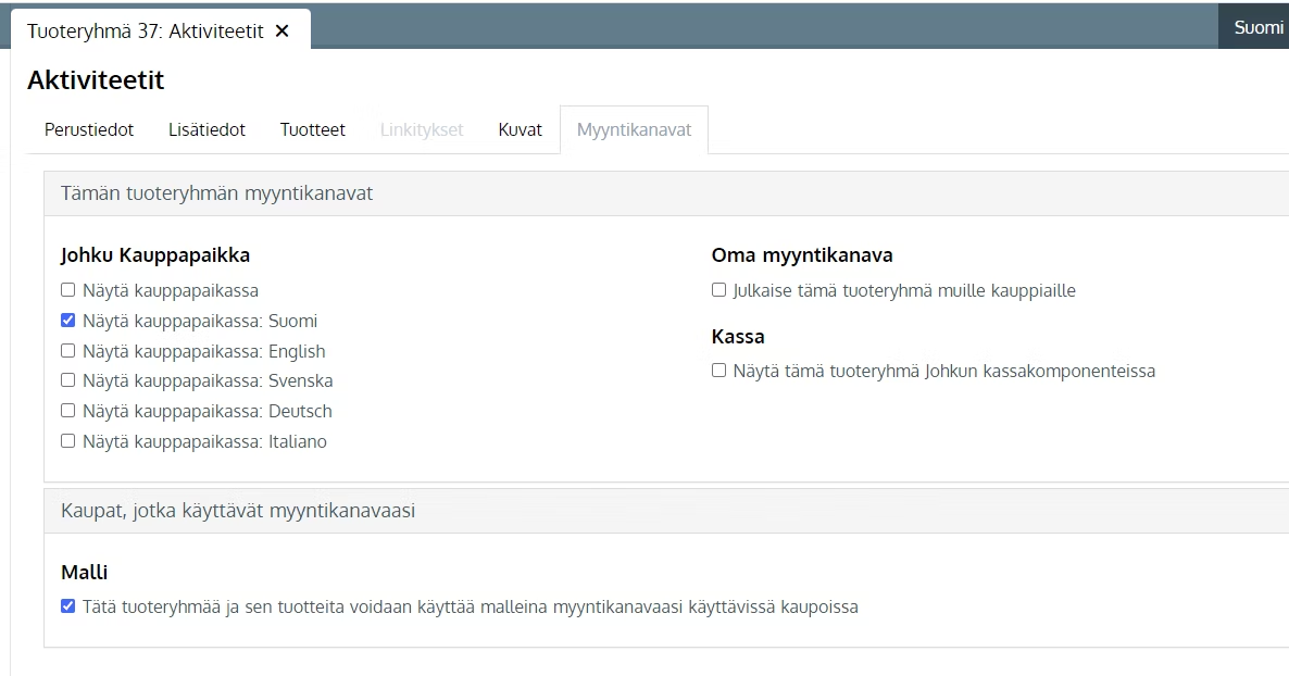 - Klikkaa tuoteryhmä auki Tuotteet-sivulta ja avaa sen Myyntikanavat-välilehti
