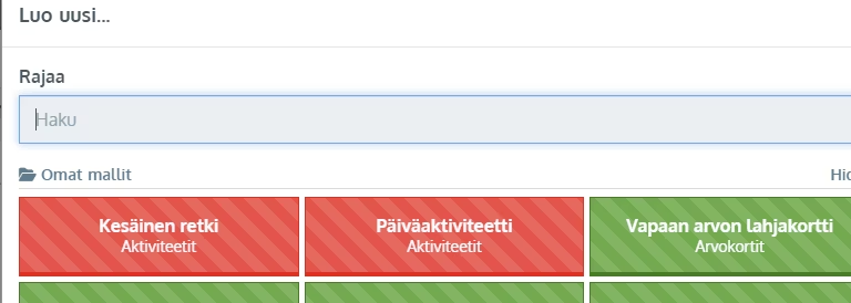| Tuotemallien käyttäminen perustuu siihen että tuoteluonnissa et valitse tuotetyyppiä, vaan suoraan valmiin mallipohjan tuotteellesi. Kauppaasi generoituu tällöin mallin pohjalta tuote, jossa on täysin samat tiedot kuin mallissa: esittelytekstit, resurssi ja saatavuus, hinnat, viestit. Jos mallissa on tuoteoptioita, myös ne generoituvat kauppaasi ja kytkeytyvät samoin asetuksin tuotteeseesi kuin mallissa.