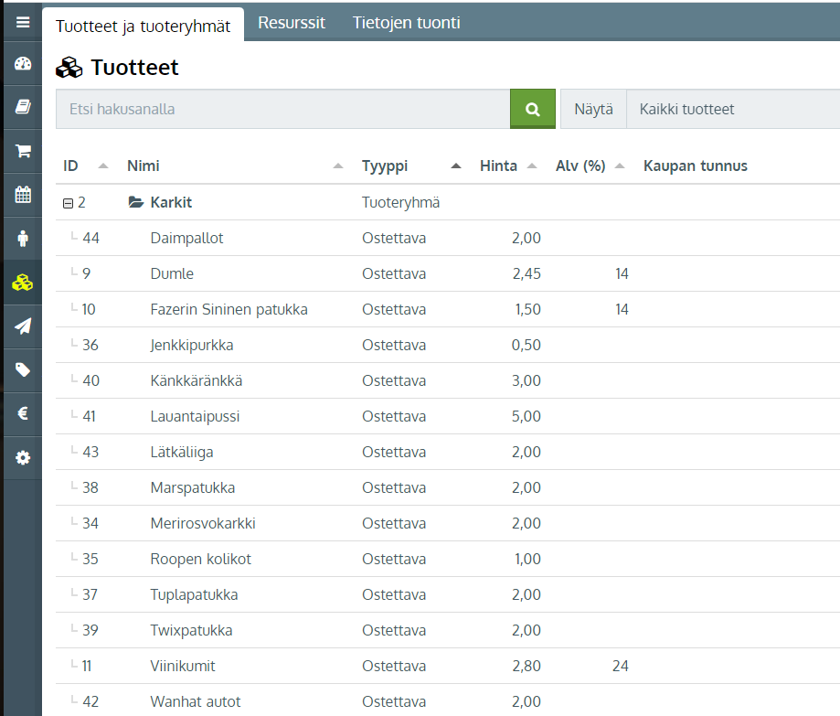||| Tietojen tuonti -toimintoa käytetään vain ostettava tuote -tyyppisten tuotteiden luomiseen Johkuun. Toimintoa ei voi käyttää muuntyyppisten tuotteiden luontiin tai tietojen lataamiseen Johkuun.