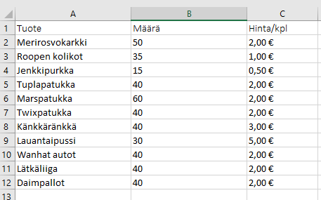 1. Muodosta Excel-tiedosto tuotteista, jotka haluat luoda Johkuun